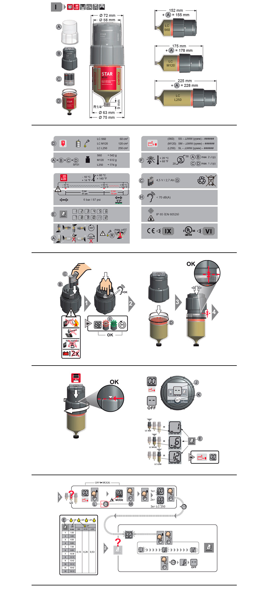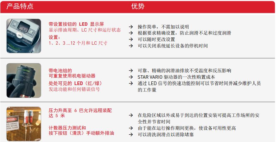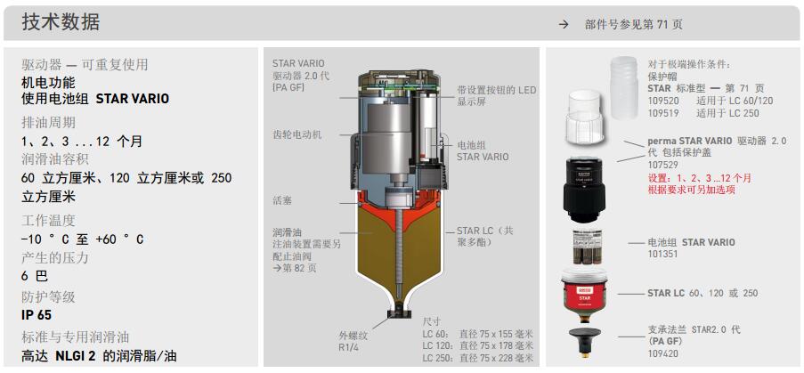 perma STAR VARIO 全自動操作,不受溫度和壓力的影響而且排油非常精確。該係統包括機電驅動器、裝 60、120 或 250 立方厘米潤滑油的 LC 和電池組。方便使用設置按鈕選擇所需的排油周期和 LC 尺寸並立即顯示在顯示屏上。在顯示屏上以及通過處處可見的 LED 信號燈(紅/綠)顯示當前的運行狀態。LED 信號也可以遠程識別。