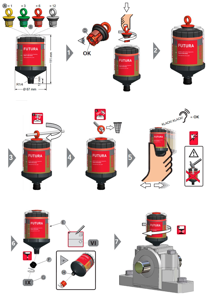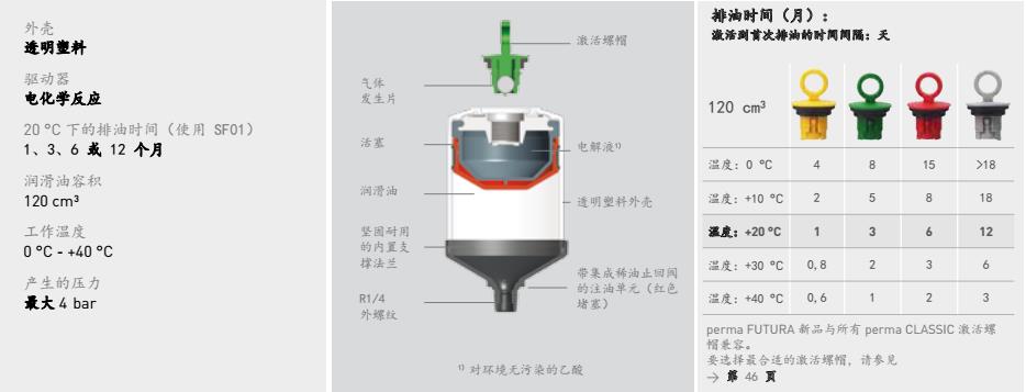 對於那些對衛生條件要求較高的區域或可能會腐蝕金屬注油器或電子係統的惡劣工作環境,perma FUTURA 是理想的自動潤滑係統。它基於電化學反應的工作原理極其可靠。其潤滑周期取決於按顏色區分的激活螺帽。