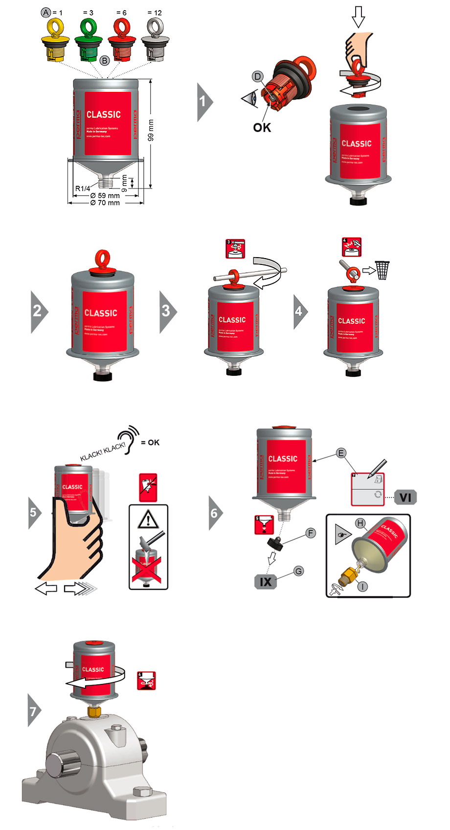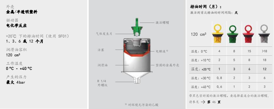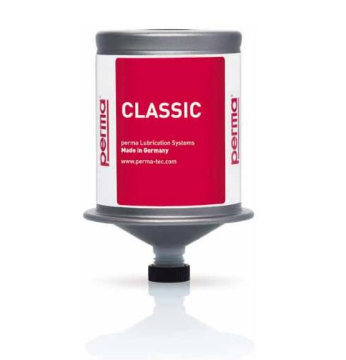 perma CLASSIC 可在 0 °C - +40 °C 的環境溫度下使用,其基於電化學反應的工作原理 安全可靠。其潤滑周期取決於按顏色編碼的激活螺帽。根據應用的具體需求,您可以 分別選擇在 1、3、6 或 12 個月內排完 120 cm³ 潤滑油。由激活螺帽產生的壓力(最 大 4 bar)可推動活塞向前移動,這樣就可以持續不斷地將潤滑油一點一點地注入潤滑 點。perma CLASSIC 還能完全防塵和防水,並能承受撞擊和意外碰撞。