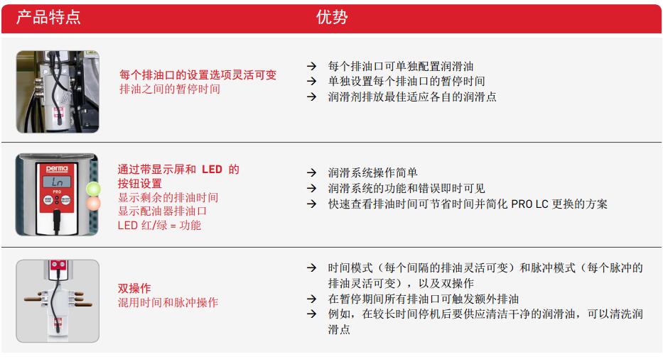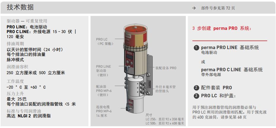 perma PRO LINE 和 perma PRO C LINE 是用於線性導軌的可變多點潤滑係統。排 油可精確適應製造商的規格。六個排油口都可以靈活設置潤滑油的數量和再潤滑間 隔。PRO LC 注滿 250 或 500 立方厘米的潤滑脂。產生的高壓使每個排油口的遠程裝 配使用潤滑脂管線長達 5 米。這增加了工作場所的安全性,同時允許對運行中的係統 進行可靠潤滑。